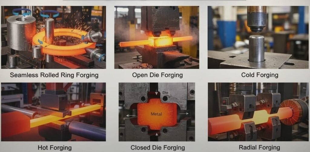 Open-Die Forging – Large components shaped by repeated blows. Closed-Die (Impression Die) Forging – Metal pressed into shaped dies for precise parts. Cold Forging – Performed at room temperature for high accuracy and finish.