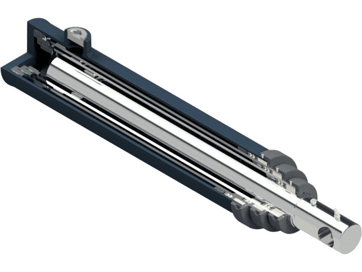 Multi-stage extension for applications where space is limited but long stroke is required. Perfect for dump trucks, cranes, and lifting systems.